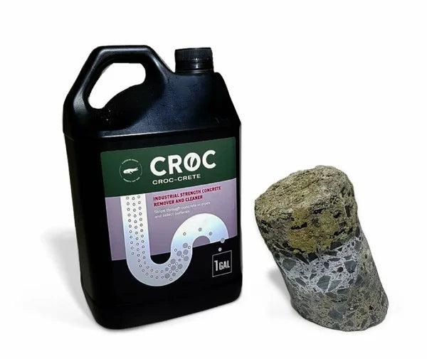 Croc-Crete® is a groundbreaking concrete mortar dissolver that dissolves concrete, mortar, tile grout, and floor leveling compound from pipes and conduits that are filled with these substances.